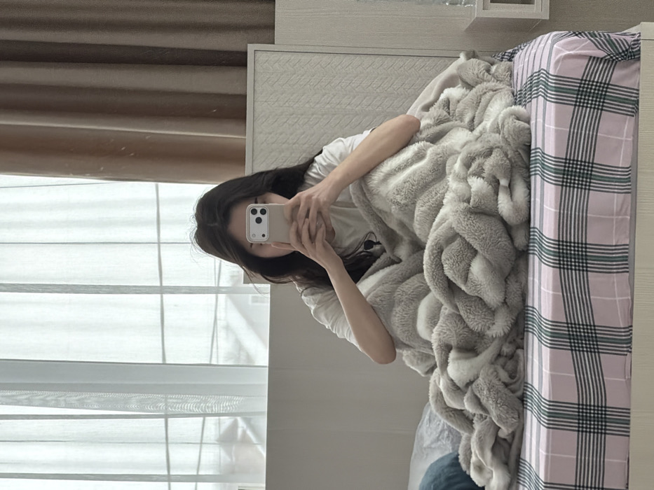 An individual is seated upright on a bed in a bedroom located in Ershov, Russia. The person, exhibiting long dark hair and wearing a white t-shirt, holds a light-colored smartphone with a triple camera array, obscuring the majority of their face. A light gray, plush blanket is wrapped around their lower body and legs, resting on a bed fitted with a pink and green plaid sheet. A blue pillow is partially visible on the bed's left side. Behind the bed, a large window is covered by sheer white curtains and brown drapes, revealing an overcast outdoor environment with indistinct structures. A white headboard and a white, textured furniture piece with a small light-colored object on its surface are visible to the right.