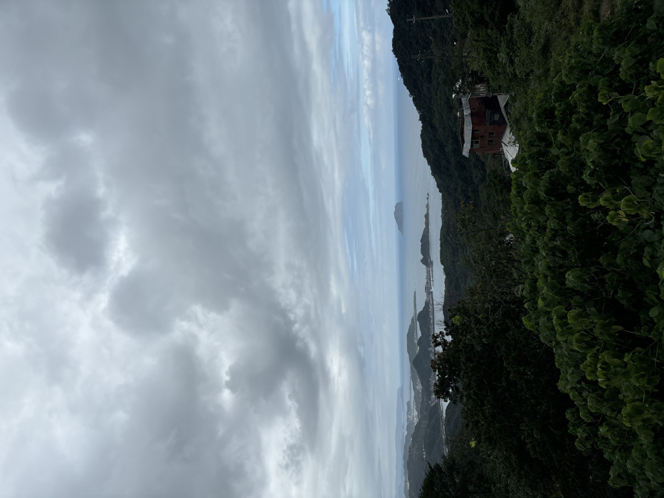 A landscape view with an overcast sky. The foreground features lush green vegetation along a hillside. A building is perched on the slope amidst the trees. The sea stretches into the distance with islands dotting the horizon. The perspective is slightly tilted, emphasizing the verticality of the scene.