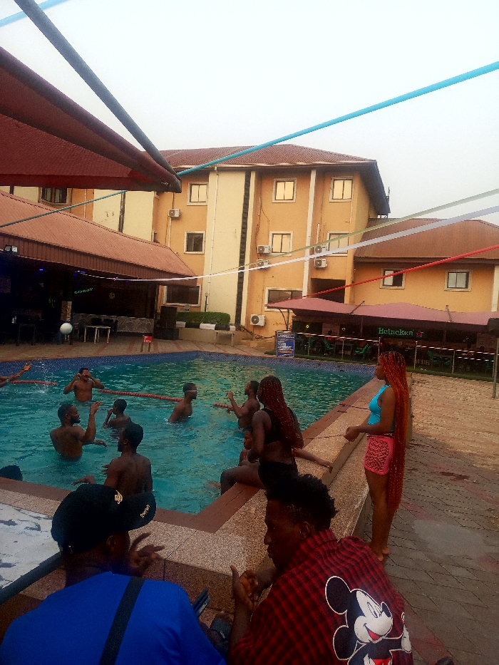 People gather at an outdoor pool. Some are in the water playing, while others sit or stand by the edge. A woman with long braids stands near the pool. Two men sit in the foreground. A building with multiple windows is visible behind the pool. Decorative banners hang overhead.