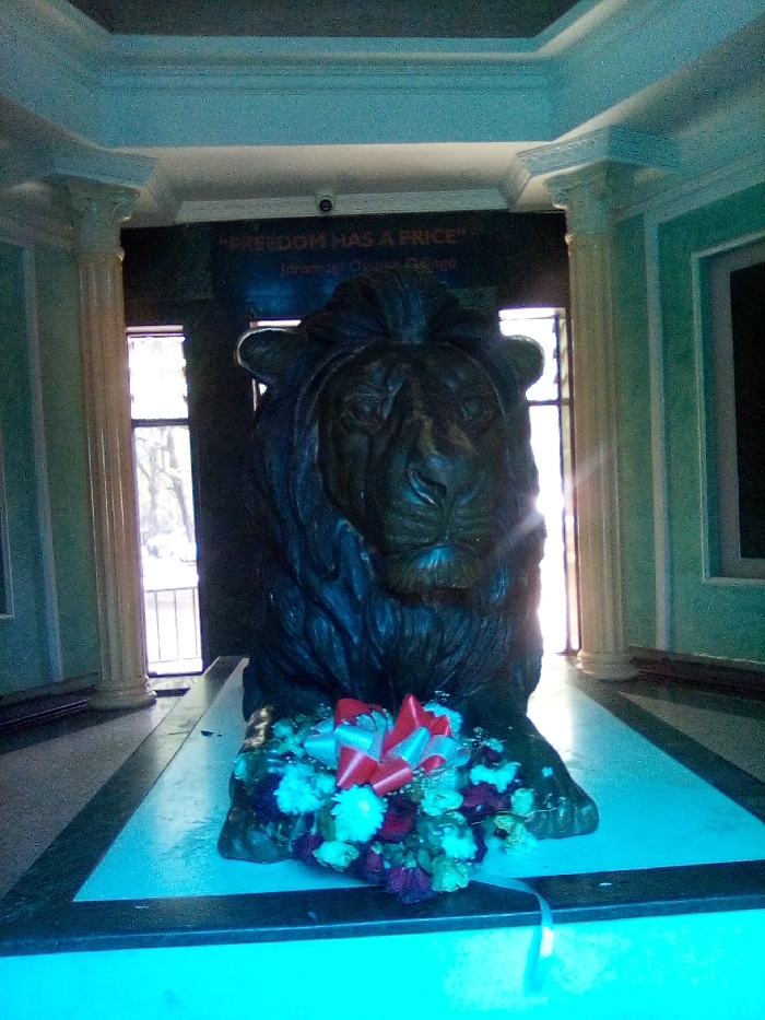 This image presents a solemn indoor scene located in South Sakwa ward, Kenya. A large, dark-colored statue of a lion, depicting a detailed head and mane, is centrally positioned on a light-colored, two-tiered plinth. A bouquet of red and white flowers, adorned with a red and white ribbon, rests directly in front of the lion at its base. Behind the statue, a dark wall displays the inscription "FREEDOM HAS A PRICE" with "Jaramogi Oginga Odinga" positioned below it. A small security camera is mounted above the inscription. The architectural environment includes light-colored fluted columns with classical capitals, light teal-colored walls with molding, and an ornate, light-colored ceiling cornice. Tall, vertical windows situated behind the lion statue provide natural light, revealing indistinct exterior foliage. The floor in the foreground matches the light color of the plinth.