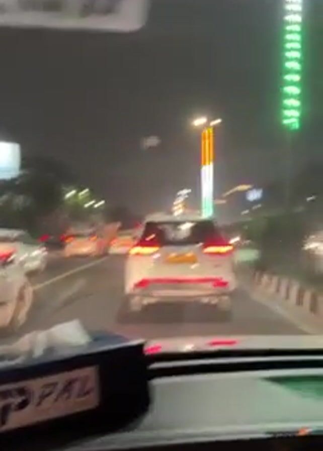 n interior view from a moving vehicle on a city road at night. The road is busy with traffic. In the foreground, the dashboard of the car has a tissue box with "PAL Tours & Travels" written on it. A driver in a dark shirt is visible in the shot, focused on driving. Outside, a tall illuminated pole, displaying the colors of the Indian flag (saffron, white, and green), stands alongside the road. Streetlights and vehicle headlights illuminate the scene.