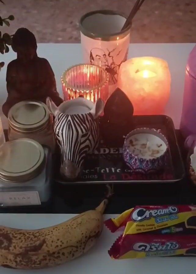 A table holds a collection of objects. There are various candles, some lit, as well as incense sticks in a ceramic container. A small zebra head figurine sits next to a black crystal on a small tray with text on it. A banana with brown spots and a package of "Cream-O" cookies are positioned in the lower foreground. Also on the table are a statue of Buddha and several other decorative items. The scene is dimly lit. The table sits in front of a dark colored cabinet or wall. The floor is a beige speckled surface. A small potted plant sits in the top left corner.