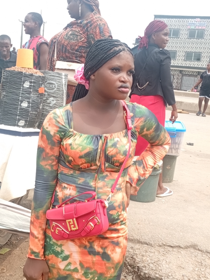 The image depicts an outdoor street scene in Ura Nta Umuarandu, Nigeria, featuring multiple individuals and merchandise displays. In the foreground, a young adult female with dark skin and dark braided hair, styled with a pink scrunchie on her right side, stands facing slightly right of the viewer's center. She wears a form-fitting, long-sleeved dress with an orange, green, and black tie-dye pattern, featuring a square neckline with a small drawstring. A small, bright red crossbody bag with gold-colored hardware, including a distinct 'F' or Greek key-like emblem on the flap, is slung across her front. Her expression is neutral. To her left, partially obscured, a display includes an inverted orange bucket with brown granular material piled at its base, sitting on top of a black bag marked "MAX." Further left, an adult male with a patterned sleeveless top smiles, alongside a younger male. Behind the foreground female, another adult female with reddish-brown braided hair, a black jacket, and a red skirt looks to her right. A heavier-set adult female in a brown and orange patterned top and a light shoulder bag is visible in the mid-ground. In the background, a multi-story building with a light and dark grey facade features square windows and a sign reading "SPANISH MODERN." The ground is a mix of worn concrete and dirt. To the right of the foreground subject, a light blue plastic container and a dark green bucket are visible on the ground. The sky is bright and overcast.