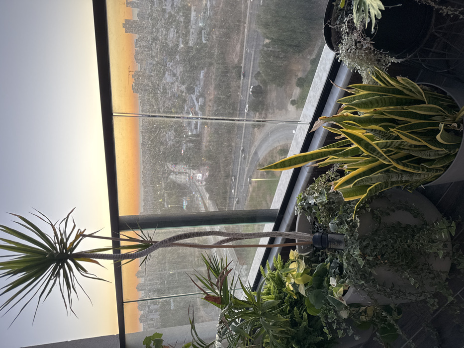 The image depicts a high-angle view from a residential balcony in Rishon LeZion, Israel, at dusk or sunset. The foreground features a collection of potted plants: a tall Dracaena marginata with two slender stems occupies the central foreground, planted in a light grey cylindrical pot from which Ficus pumila trails. To the right, a Sansevieria trifasciata 'Laurentii' (snake plant) with yellow-edged leaves is in another grey pot. Additional green foliage plants, including ferns, are visible in other pots. An irrigation dripper is attached to the base of the Dracaena. The balcony floor appears dark. A glass railing with a dark horizontal top rail separates the balcony from the urban panorama. The glass panels show visible dust or water spots. Beyond the railing, a vast cityscape stretches into the background. A multi-lane highway (likely a section of Highway 4 or 20) with active vehicle traffic, indicated by visible lights, curves through the mid-ground from left to right. Numerous multi-story buildings, including taller high-rises, populate the urban landscape, interspersed with patches of trees and vegetation. The western horizon exhibits an orange and yellow glow from the setting sun, transitioning into a light blue sky above, with a faint line suggesting the Mediterranean Sea in the distance. No individuals are visible.