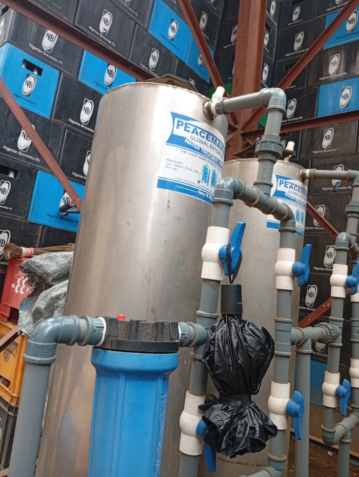 The scene depicts a water treatment system located in an outdoor or semi-sheltered commercial area in Onitsha, Nigeria