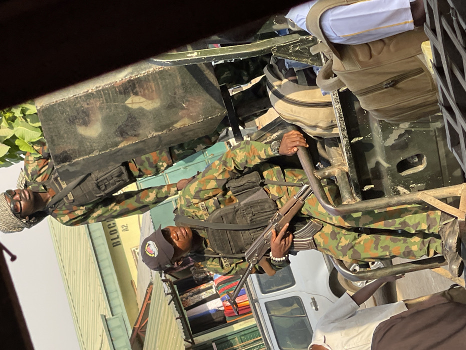 The image displays two Nigerian Army soldiers within an open-back military utility vehicle on a street in Samaru, Nigeria