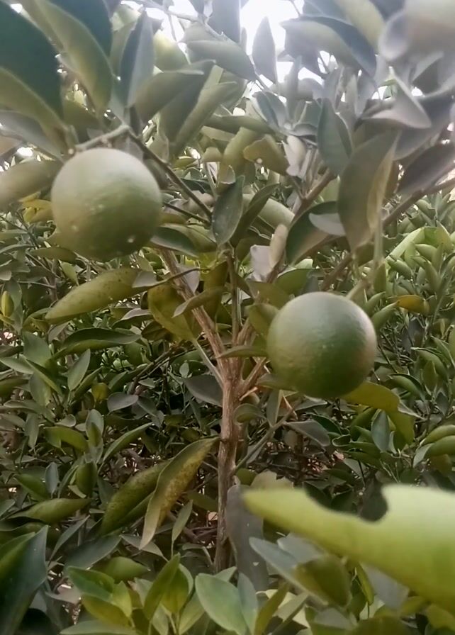 close-up view of an orange tree. The tree has many green leaves and several unripe green oranges. The camera angle is looking up into the branches of the tree. The sunlight filters through the leaves, creating a bright, diffused light.