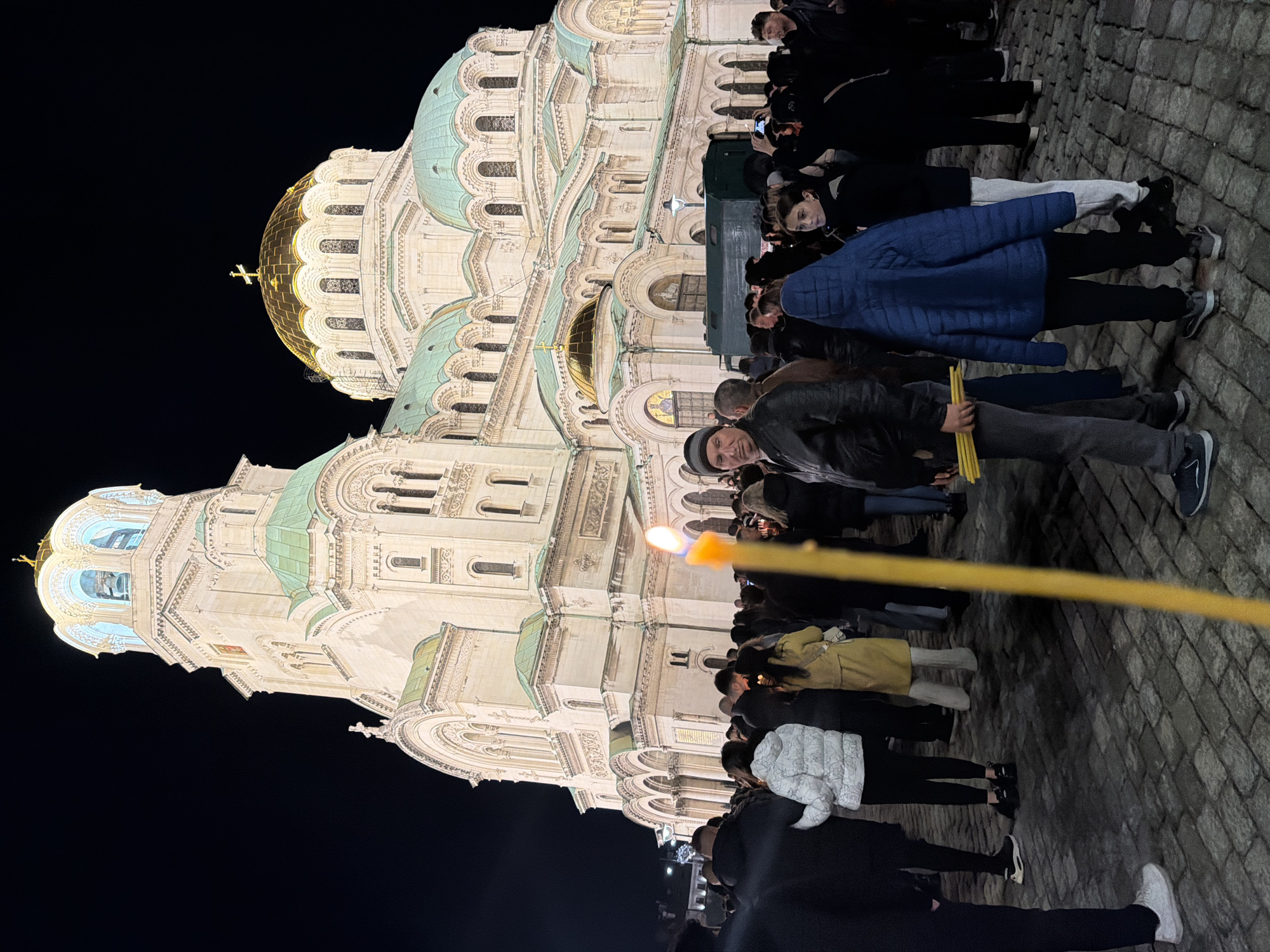 Alexander Nevsky Cathedral in Sofia, Bulgaria at night. A crowd of people are standing in front of the cathedral, many holding lit candles. The cathedral is brightly lit, and its gold dome is visible. The street is paved with stone. A row of yellow candles are visible in front.
