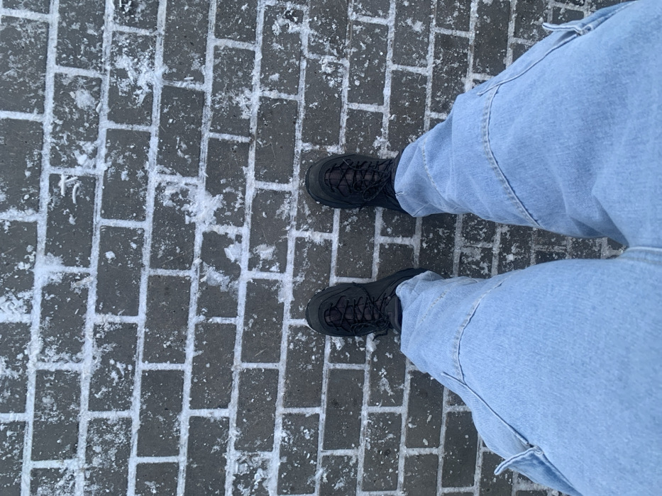 - "The image displays a top-down view of the lower legs and feet of an individual standing on a partially snow-covered paved surface in the city of Mozhga, Russia" by FM-RWjjF2, licensed under CC BY 4.0
