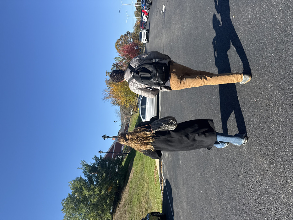 Two individuals walk away from the viewer on a dark asphalt surface under a clear blue sky in a campus-like environment in Waltham, United States. The person on the left has long, curly, light brown hair, wears a long black coat over blue jeans, and carries a patterned shoulder bag. The person on the right wears a light gray puffer jacket, tan corduroy pants, and a black backpack with "A.P.C." visible on its front pocket. Strong sunlight casts distinct shadows of the individuals on the pavement. To the left, a grassy embankment ascends towards brick buildings featuring multiple black ornamental streetlights and green trees. To the right, a parking lot extends into the distance, filled with various parked cars, beyond which trees display vibrant autumn foliage in shades of yellow, orange, and red.