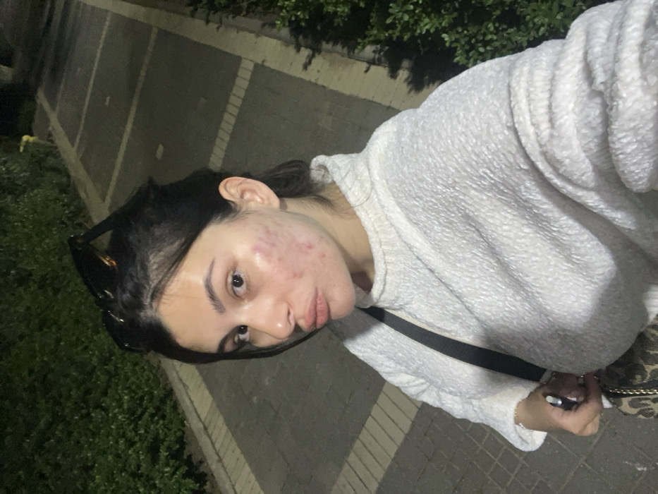 A female individual is depicted in a close-up, self-portrait style photograph taken at night outdoors in Kiryat Motzkin, Israel