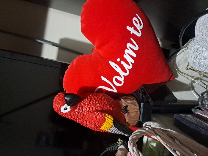 The image depicts an interior scene, specified as Spanchevtsi, Bulgaria. In the foreground, a red decorative parrot figurine with a black beak, white eyes, and yellow/black wing accents stands on a simulated wooden base. To the immediate right of the parrot, a red, heart-shaped plush pillow is positioned, bearing the white embroidered text "Volim te". Both items rest on an indeterminate surface. Partial visibility of a light-colored woven basket and a fabric bag is observed on the left side of the frame, underneath the parrot. A string of decorative lights with white spherical covers is partially visible in the lower right foreground. The background is indistinct, featuring a dark, possibly reflective surface on the left and a lighter wall section on the right, suggesting indoor furnishings. No individuals are present.