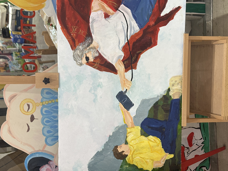 A painting on a wooden easel depicts a modern parody of Michelangelo's "The Creation of Adam