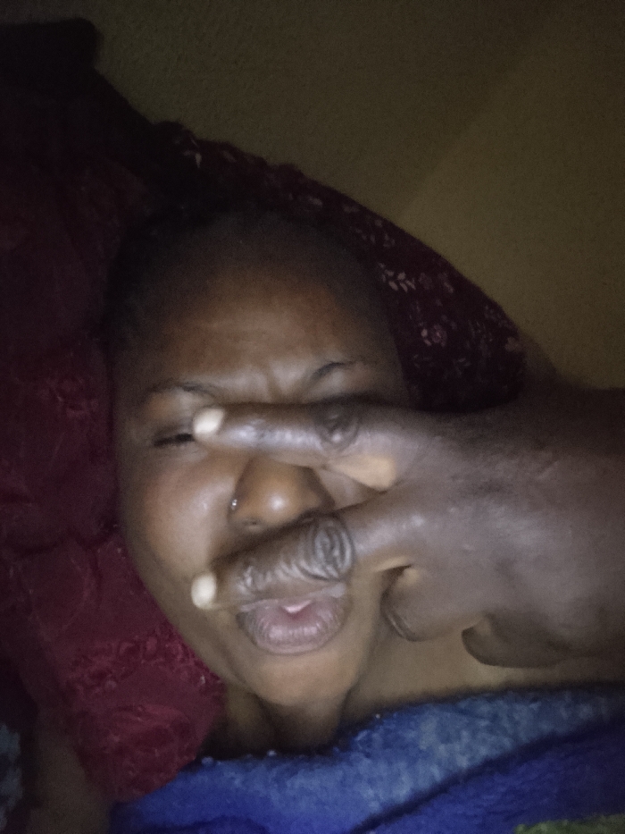 A close-up shot captures a person lying down, obscured by a hand forming a "V" shape across their face. One eye is visible, while the other is covered by the hand. The person has a nose ring and slightly parted lips. They are surrounded by bedding, including a dark red patterned cloth and a blue blanket. The lighting appears dim, contributing to the overall mood.