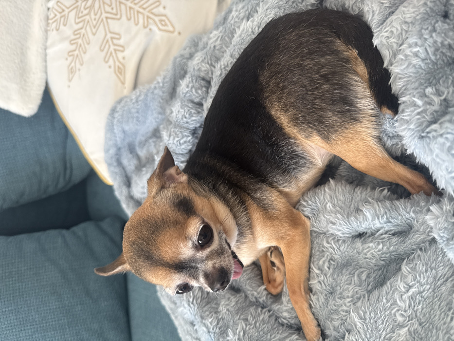 - "A tan, brown, black, and grey Chihuahua is positioned centrally within the frame, lying on a light blue, plush, textured blanket" by FM-xxCob2, licensed under CC BY 4.0