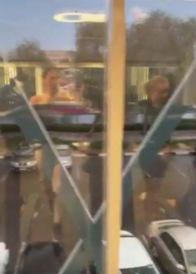 The view from inside a building through a window reveals a rainy outdoor scene with a parking lot. Two women are reflected in the glass. The woman on the left has long brown hair and is wearing a light colored top and pants. The woman on the right has blonde hair and is wearing a dark top and shorts. Several cars are parked in the parking lot. A large "W" is also visible in the glass from an architectural design.