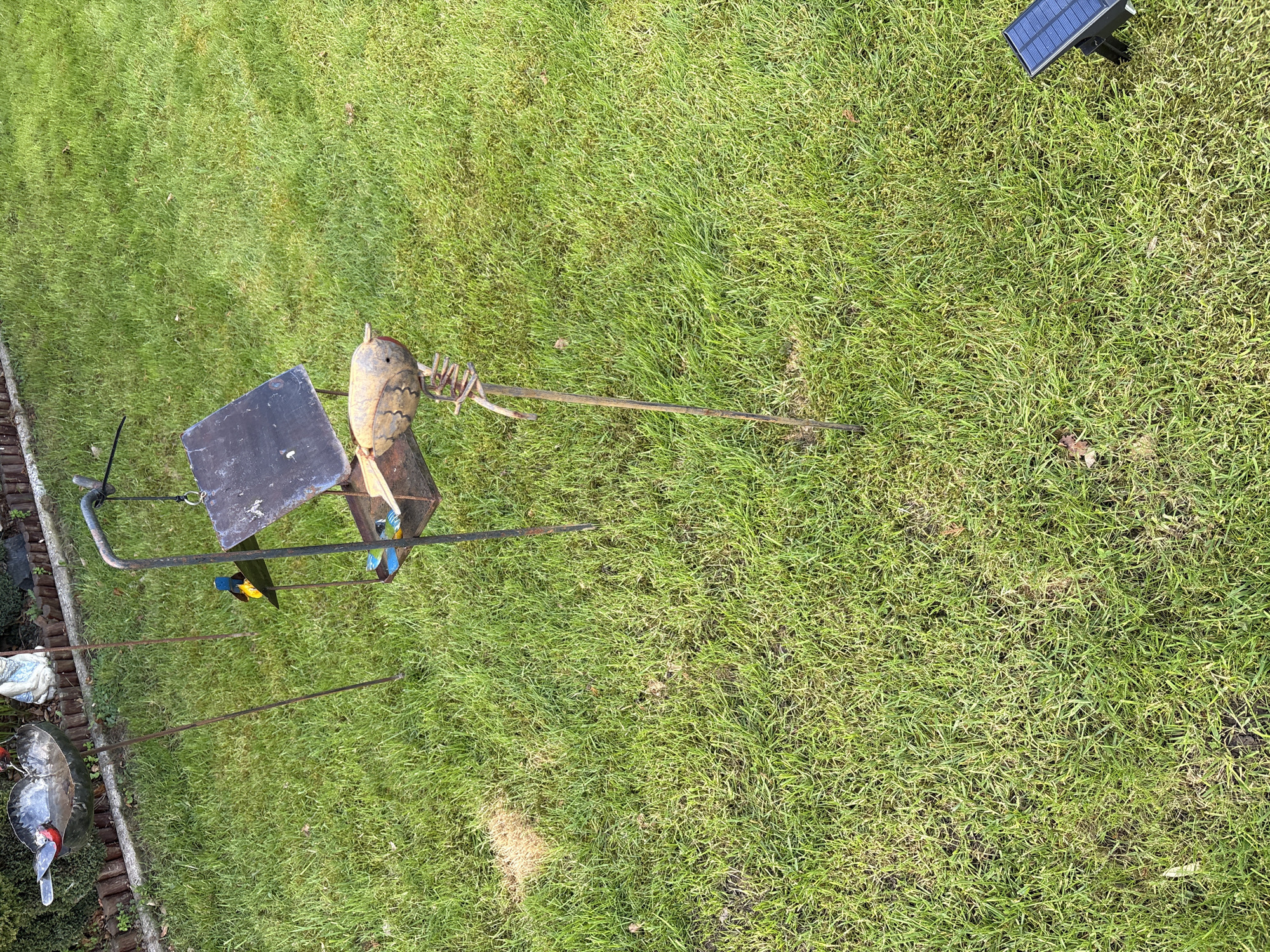 The scene is an exterior shot of a grassy lawn, likely a backyard, located in Minsterley, United Kingdom. Several garden ornaments are present, including a metal bird sculpture with a flat, square platform extending from it, and a bird feeder on a stand featuring colorful metal birds. In the upper right corner, there is a small solar panel. The grass is mostly green, with some patches of brown or dead grass visible. A border made of wooden planks or logs is visible along the edge of the lawn.