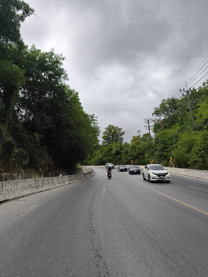 A winding asphalt road leads to a curve, lined with concrete barriers and dense green trees on either side. A motorbike and several cars, including a white Honda, are traveling along the road. Utility poles and wires are visible on the right. The sky is overcast with gray clouds. Yellow curve warning signs flank the road.