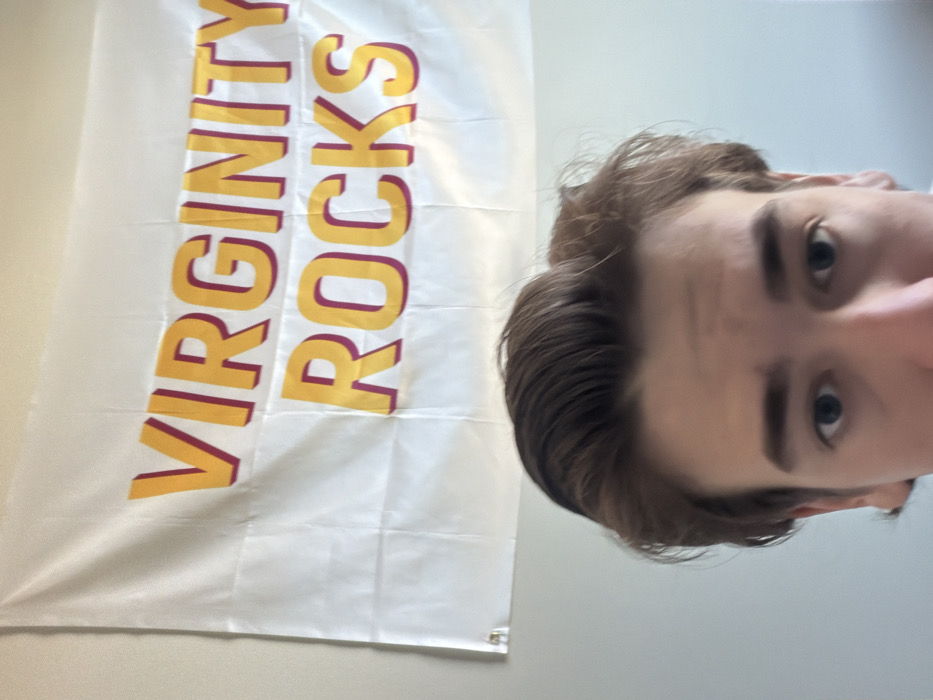 An indoor scene depicts the upper portion of a male individual positioned below a banner. The specific location within Gainesville, United States of America, cannot be determined from the image. The male has brown hair, styled with volume, and his eyes are open, looking directly forward. His forehead, eyebrows, eyes, and the bridge of his nose are visible, with the bottom of his face cropped out. Above him, a white banner is attached to a plain, light-colored wall. The banner displays the text "VIRGINITY ROCKS" in two lines, with yellow lettering outlined in red-purple. Creases are present on the banner's surface, and attachment points, including a visible grommet on the bottom left and a tack on the top left, secure it to the wall.