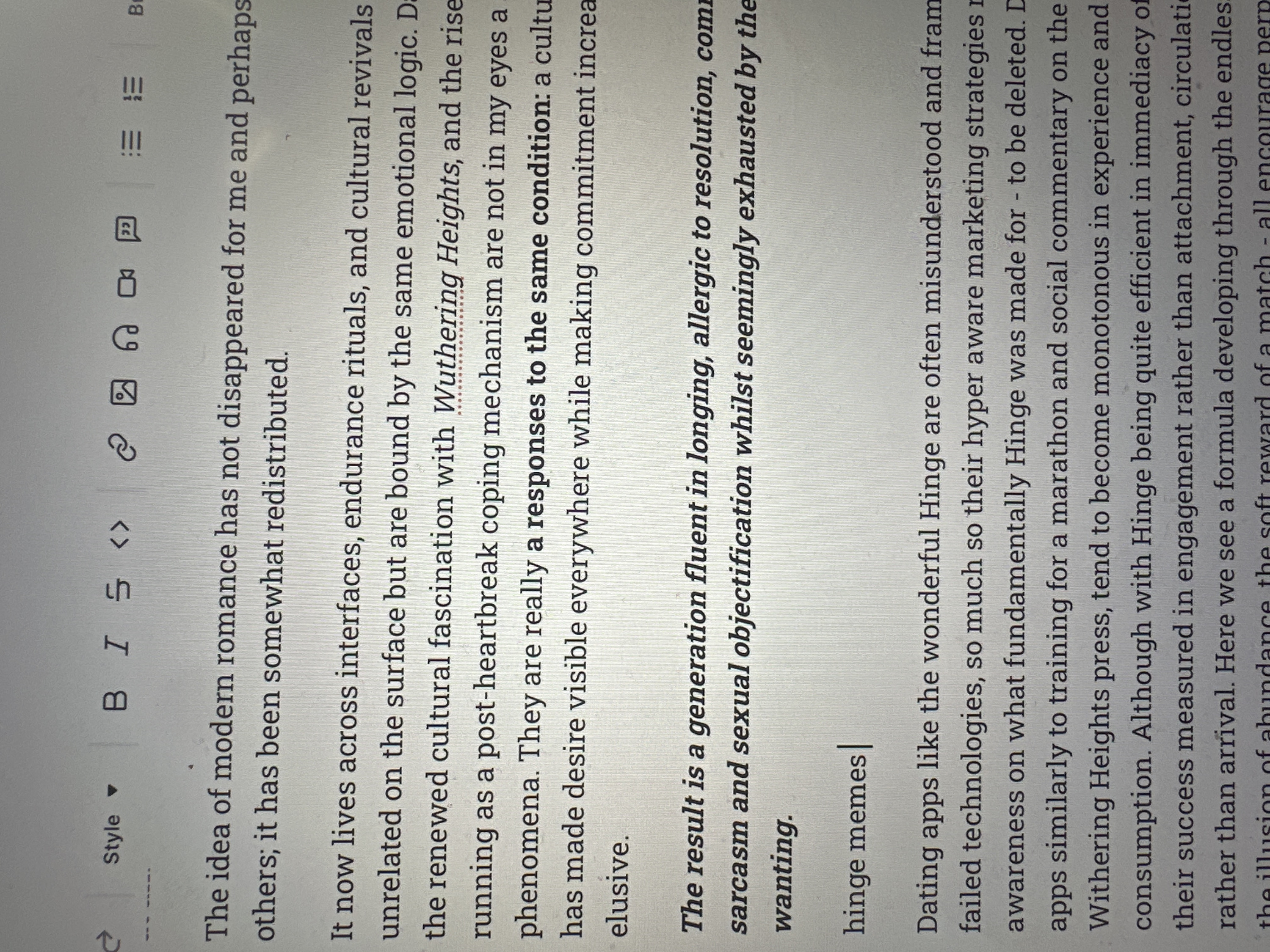 The image displays a close-up photograph of a digital screen exhibiting a text document, likely an essay or article, in an editor interface. The screen background is light grey, with dark grey text. A top toolbar is visible, featuring editing controls such as 'Style' dropdown, 'B' (bold), 'I' (italic), '<>' (code), a link icon, an image icon, an audio icon, a video icon, a speech bubble icon, and list formatting options. The primary text body discusses themes of modern romance, cultural phenomena, "Wuthering Heights," and dating apps, specifically mentioning "Hinge." Portions of the text are bolded, italicized, and a red dotted underline is present beneath "Wuthering" in "Wuthering Heights," indicating a potential spelling or grammar suggestion. A blinking vertical cursor is located after the words "hinge memes." There are no individuals depicted. The scene is digital, on-screen. Information regarding a specific physical location in the city of Wealden, United Kingdom, cannot be determined from the image content.