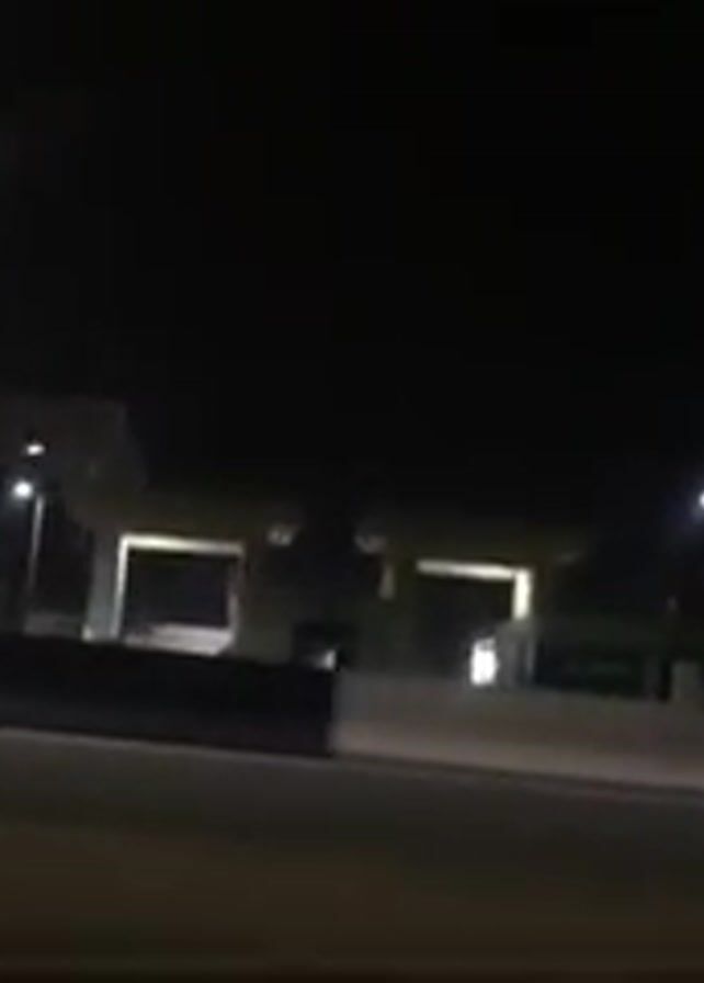 night scene from a moving vehicle. The camera is aimed toward a roadside area featuring a building with illuminated sections. There are streetlights providing illumination along the road and around the building. The road is separated from the roadside area by a barrier. As the vehicle moves, a police car with flashing red and blue lights becomes visible. The surroundings are dark.