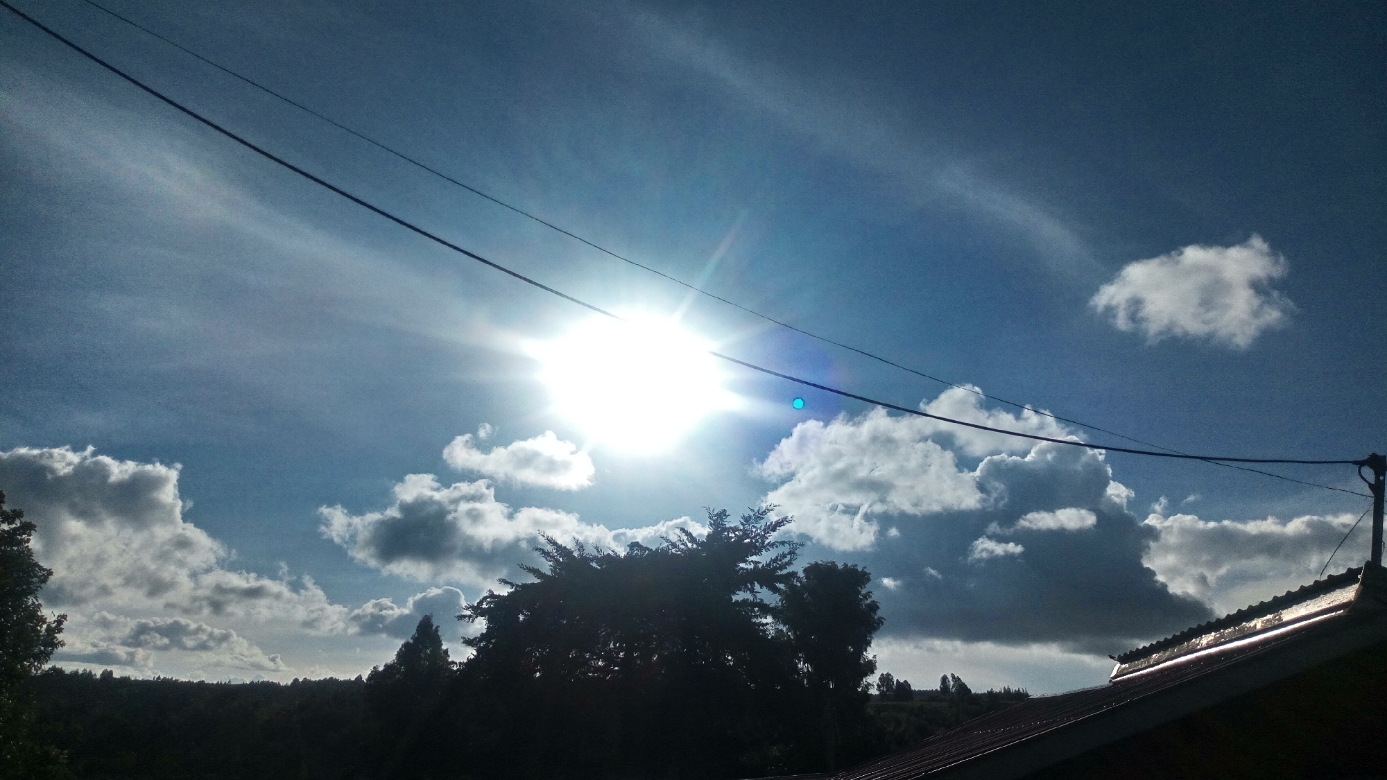 The image displays an outdoor scene in Ndeiya, Kenya, captured during daylight hours. A bright, central sunburst with associated lens flare dominates the upper-middle sky, which is predominantly blue with scattered white and grey cumulus clouds. Two dark, horizontal utility wires span the width of the frame in the upper section. The foreground features the upper portion of a reddish-brown corrugated metal roof on the right, connected to a dark utility pole from which wires extend. Below the wires, the middle and left foreground are occupied by dark, silhouetted trees and dense foliage. A distant, rolling landscape covered in trees is visible along the horizon line beneath the clouds. No people or overt actions are depicted.