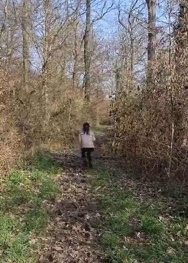 A young person walks down a muddy path in a forest. The person is wearing a light-colored jacket, dark pants, and has dark hair in a ponytail. The trees surrounding the path are mostly bare, with some brush and green grass visible. The sky is blue and clear.