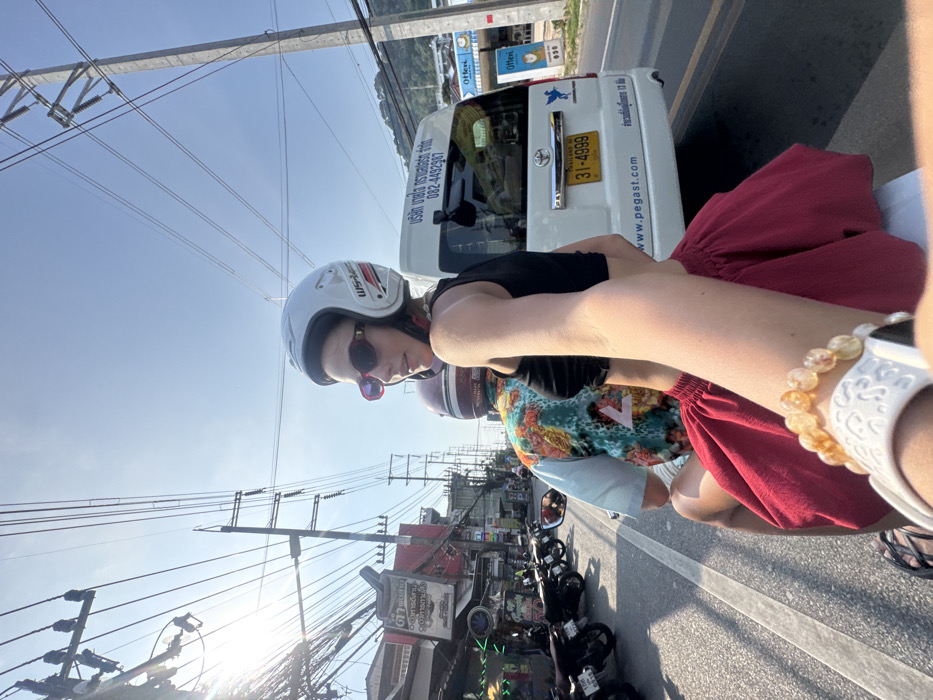 An image captured in Patong, Thailand, depicts two individuals riding a scooter on a sunny day
