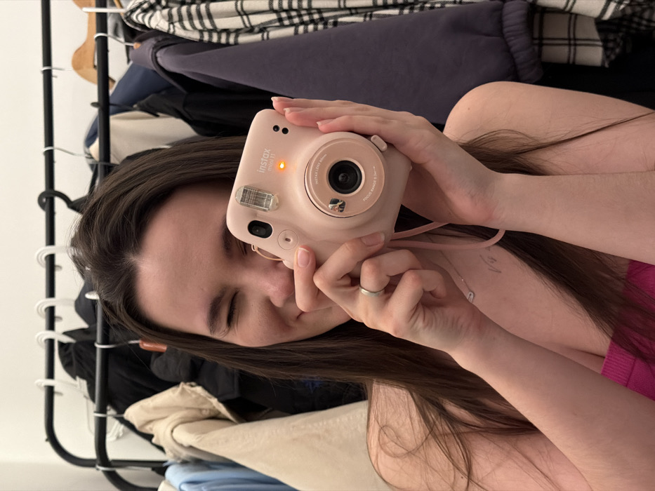 A young woman poses, holding a pink Instax Mini 11 camera. Her dark hair falls around her shoulders, and she wears a silver ring and a delicate necklace. A clothing rack with various garments is visible in the background. She is wearing a pink top. The photo is taken at an angle, giving a casual, selfie-style impression.