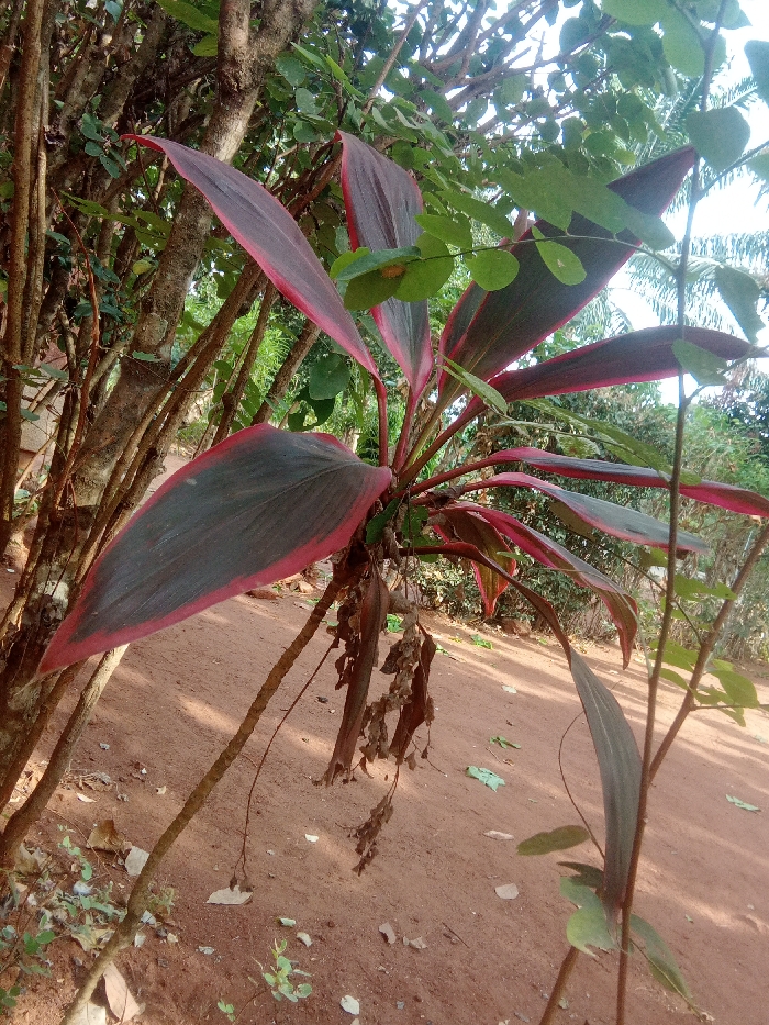 The scene is an outdoor environment located in Nsukka, Nigeria. The primary subject is a leafy plant with broad, elongated leaves that display a dark green or purplish center and prominent reddish-pink edges. Several dried, brown leaves hang from the lower portion of this plant's central stem. To the left, multiple slender tree trunks and branches with textured light brown bark rise, partially covered in green foliage. The ground surface is composed of exposed reddish-brown soil, typical of laterite, with sparse ground cover including small dried leaves and plant fragments. Distant green vegetation and trees are present in the background. The scene is illuminated by natural daylight. No persons, animals, or artificial structures are observed.