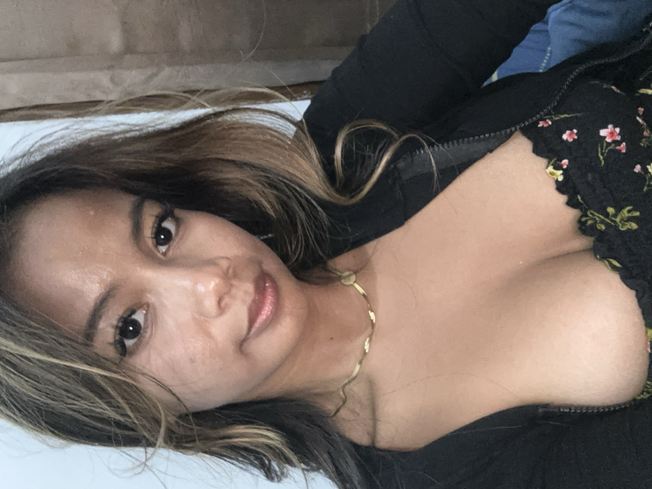 A close-up, eye-level image depicts an adult female positioned off-center, gazing directly forward. Her hair is dark brown with lighter blonde or caramel highlights, styled in loose waves and framing her face. Her complexion is tan. She wears a gold-colored snake chain necklace featuring a small, circular pendant. Her attire consists of a black, long-sleeved jacket or cardigan, partially unzipped, revealing a black, floral-patterned strapless or off-the-shoulder top with small red and green flowers and a ruffled neckline. Significant cleavage is visible. The background is indistinct and out of focus, suggesting an indoor setting. A light-colored, possibly white wall is visible behind her left shoulder, and a darker, textured surface, potentially wood, is behind her right. A blue fabric or object is partially visible in the lower right portion of the background. The specific location within the city of Celuk, Indonesia, is not discernible from the visual information provided in the image.
