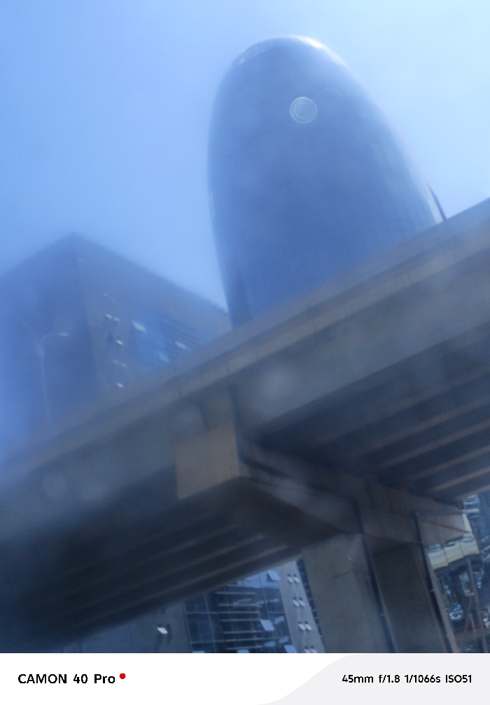 A blurred, upward-angle shot captures a futuristic elevated train car with a rounded top against a light blue sky. A concrete infrastructure supports the train, showing a series of parallel beams. A modern glass building is visible through the structural elements. At the bottom, camera details are displayed: "CAMON 40 Pro" and "45mm f/1.8 1/1066s ISO51". The lighting is bright, washing out some details.