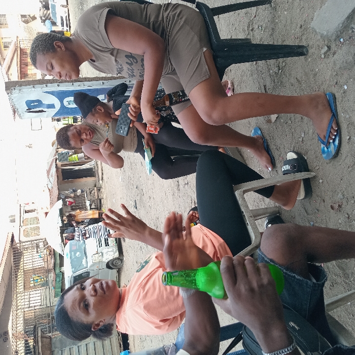 The image depicts a casual outdoor gathering of four adults and one child in Alaiyabiagba, Nigeria. In the immediate foreground, a person, partially visible on the left, holds a green glass bottle with their right hand. To their right, a light-skinned adult female, wearing an orange t-shirt and black leggings, sits on a white plastic stool, her left hand raised in a gesture as she appears to be speaking. Adjacent to her, a darker-skinned adult female in a brown sleeveless top and black pants sits on a black plastic chair, using a spoon to feed a young child wearing a black beanie and dark clothing, who is seated on her lap. To the right, another darker-skinned adult female, dressed in a brown short-sleeved top and shorts, sits on a black plastic chair, holding a black smartphone in her left hand and a dark-colored glass bottle in her right. The ground is unpaved dirt. In the background, a white van is parked, and various rudimentary market stalls and buildings with corrugated metal roofs are visible under daylight conditions. A large blue and white sign stands vertically in the right background.