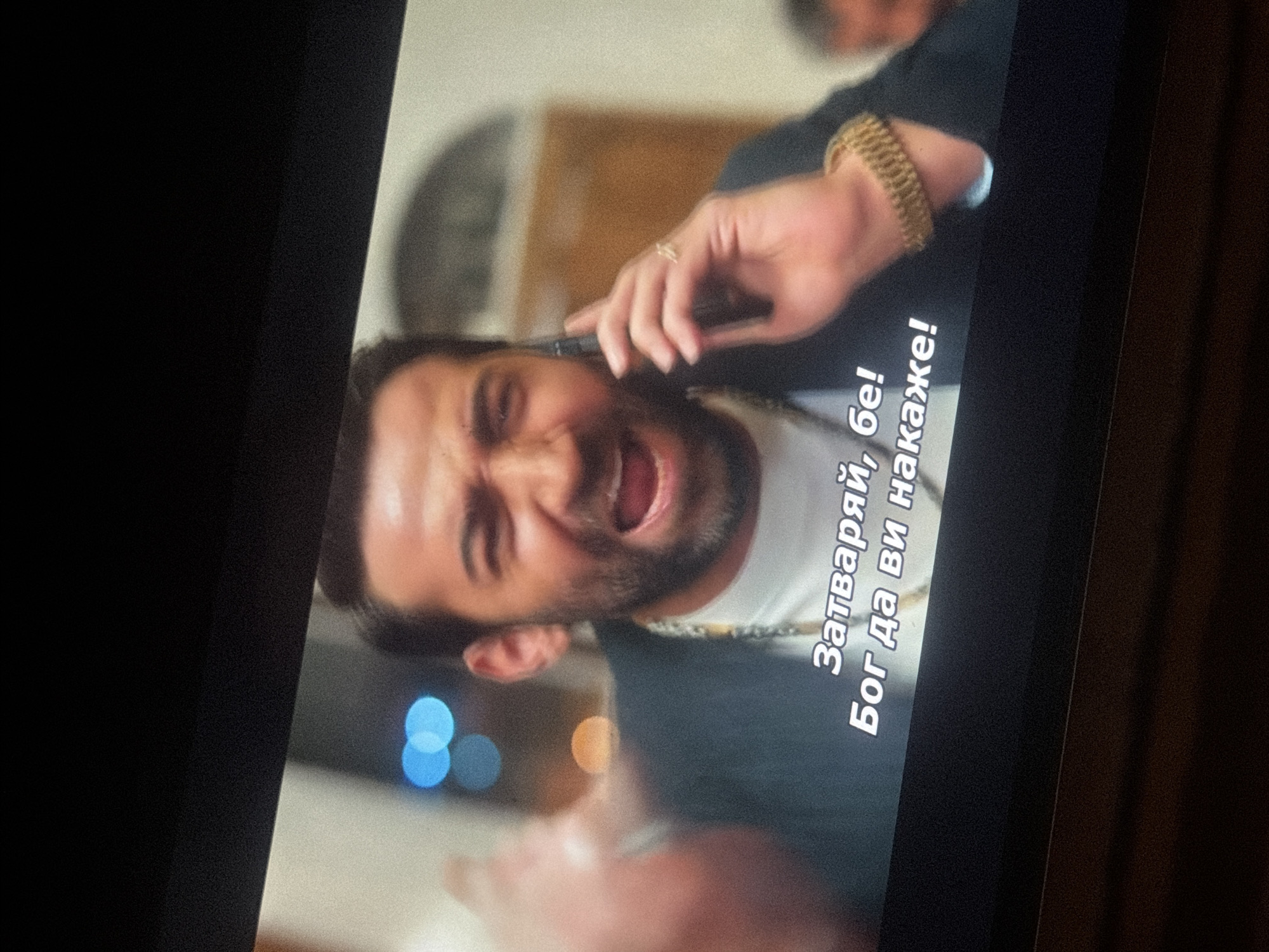 A close-up shot depicts a man with dark hair and a beard, visibly agitated, holding a cell phone to his ear. He is wearing a gold chain and bracelet. Subtitles in Bulgarian read "Затваряй, бе! Бог да ви накаже!". The location is not discernible from the image.