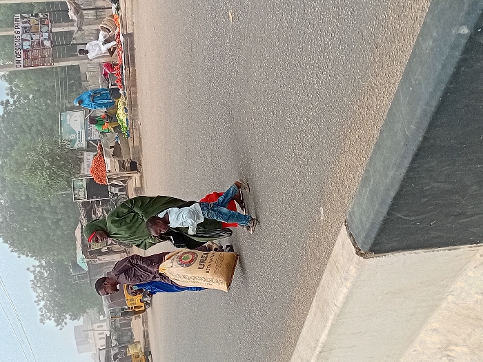 The image portrays a street scene in Dorayi, Nigeria, characterized by an asphalt road and an active roadside market. In the immediate foreground, a concrete road barrier is visible, split into a light grey section on the left and a dark grey/black section on the right, with a visible chip at their junction. On the asphalt road, three individuals proceed from the right side of the frame towards the left. The leftmost is an adult male, dressed in a dark brown long-sleeved garment and dark trousers, carrying a large light-colored sack labeled "UREA BETA MAYE" over his right shoulder and a blue item over his left. Adjacent to him, an adult female wears a green full-body covering and a red headscarf, with a dark bag at her right side. Slightly ahead and to her right, a young child walks, wearing a light blue long-sleeved shirt and blue jeans. The three appear to be moving together. Along the right side of the road, a market area is established with multiple stalls. Piles of red produce, consistent with tomatoes or peppers, are displayed on elevated surfaces, alongside green vegetables at another stall. Within this market section, three additional individuals are observed: one person in green is seated behind a stall, another person in light blue stands near a stall, and a person in white is seated on a low structure towards the far right. A vertical pole bears a sign, partially legible as "DM DESIGNS & PRINT," above the market. Further to the left, a yellow auto-rickshaw (Keke Napep) is partially visible. The background features various buildings and trees under a hazy sky.