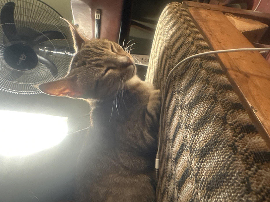 A brown tabby cat rests with closed eyes against the patterned side of a brown wooden chair. An electric fan with a metal cage sits to the left of the cat, bathed in bright sunlight. The cat's whiskers are visible, and it appears to be relaxed. A white cable runs alongside the chair, adding to the cluttered background.