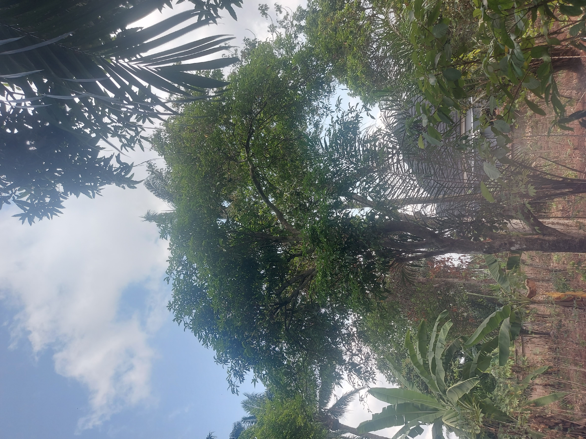 The scene depicts an outdoor environment in Alor, Nigeria, characterized by abundant tropical vegetation under a partly cloudy blue sky. A large tree with a dense canopy of dark green leaves stands centrally. To the left, several banana plants with broad green leaves are visible, alongside other palm fronds and smaller trees. The ground consists of reddish-brown soil with scattered dry plant matter and sparse low-level vegetation. In the mid-background, a building with a dark, angled roof and light-colored walls is partially visible, obscured by surrounding foliage. A rudimentary fence constructed from thin vertical wooden poles is situated in the foreground/midground. No human or animal subjects are present. The area is brightly illuminated by natural light, with a slight atmospheric haze visible in the lower central portion of the frame.