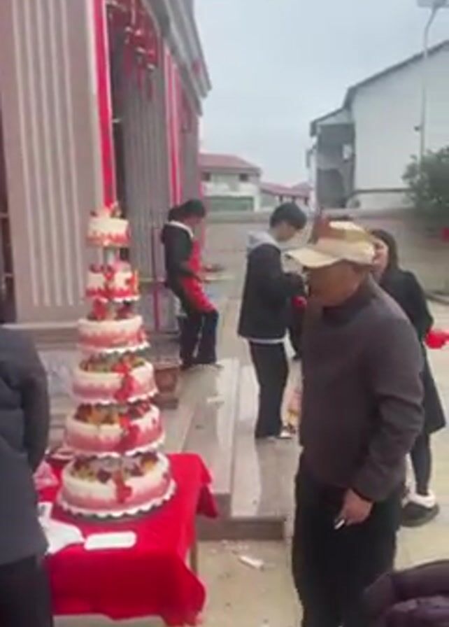 The scene unfolds outdoors, dominated by a tall, multi-tiered cake standing on a red tablecloth-covered table