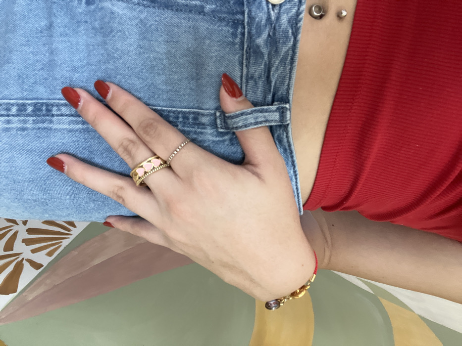 The image depicts a close-up, partial view of an individual's torso and left hand, located in San Bernardino Tlaxcalancingo, Mexico. The subject wears a red ribbed crop top, exposing the abdomen, and light blue denim jeans. A silver-toned barbell piercing with two spheres is visible in the navel. The left hand, with fingernails painted red, rests on the upper left thigh of the jeans. Two rings are worn on the left hand: a thin, silver-toned band on the ring finger, and a wider, gold-toned ring with multiple pink heart cutouts on the middle finger. A red string bracelet, featuring several gold-colored beads and a singular dark purple or maroon charm, is visible on the left wrist. The background comprises a wall decorated with an abstract mural, characterized by large, organic shapes in tones of light olive green, warm beige or light gold, and pale pink or peach.