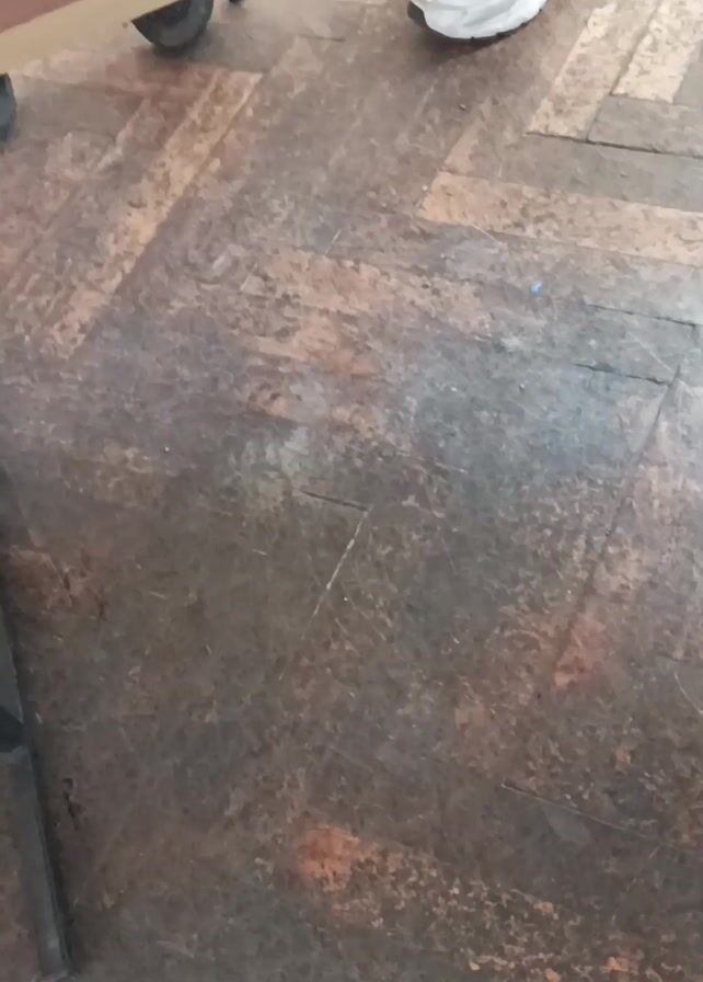 worn wooden floor in a herringbone pattern. In the top right corner of the frame, there is a white sneaker with black accents. To the left, a corner of a wooden table is visible. There are sounds of a crowd and what seems to be shouting or excited sounds.