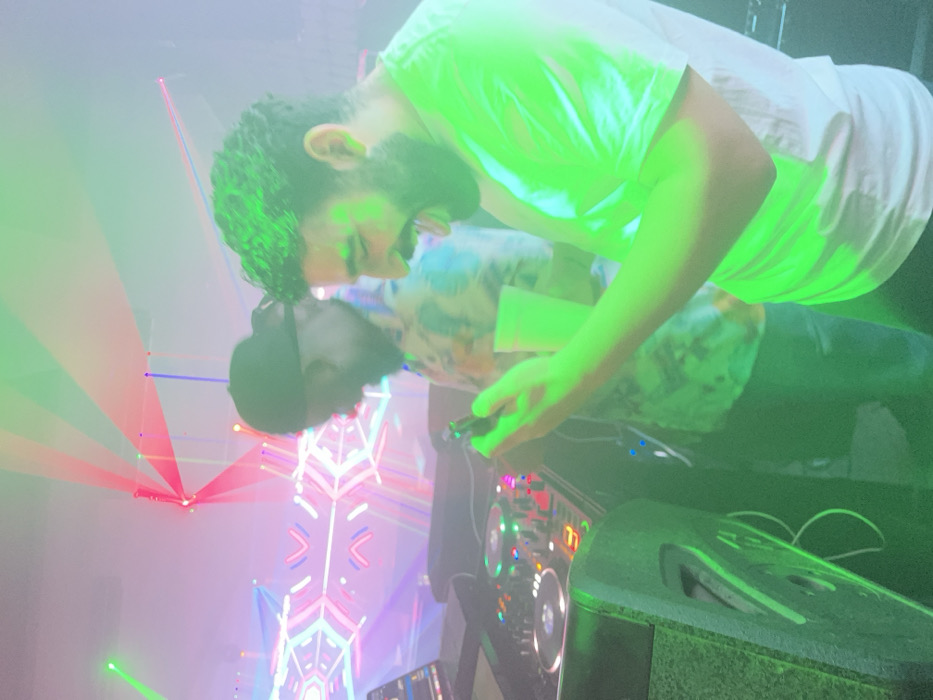 Two men stand closely in a venue lit with colorful lasers. One man has a beard and curly hair, wearing a patterned shirt and dark pants. The other man has a white t-shirt. They appear near a DJ console with illuminated buttons and knobs. A decorative light fixture with arrow shapes is visible in the background, adding to the vibrant atmosphere.