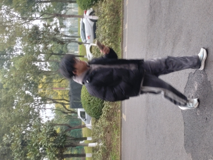 A person in a dark jacket and gray pants stands on an asphalt road. The individual wears white sneakers and appears to be holding a device. A sidewalk runs parallel to the road, bordered by green foliage. Trees are visible in the background, along with parked cars. The image seems to have been taken at an angle, with the ground on the right side of the frame.