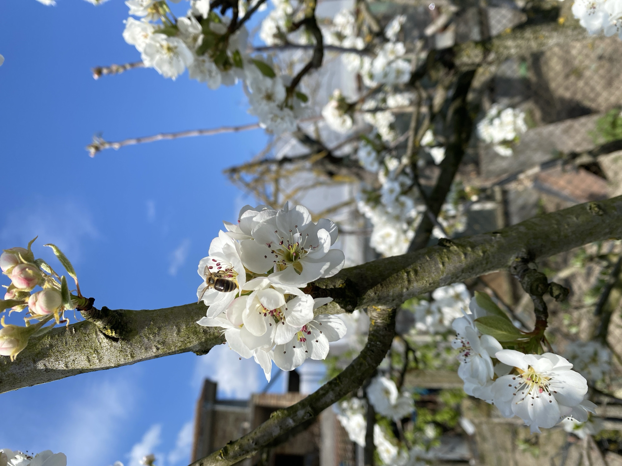 A close-up shot shows a branch of a flowering tree, possibly a pear or apple tree, filled with white blossoms. A honeybee is visible on one of the flowers, apparently collecting pollen or nectar. The background consists of a bright blue sky with some wispy clouds and out-of-focus elements. The out-of-focus elements include an indistinguishable structure, probably a building. Since the location is Konstantinovo, Bulgaria, it can be deduced that the structures are part of the cityscape. The scene presents a springtime setting with a focus on nature and insect activity.