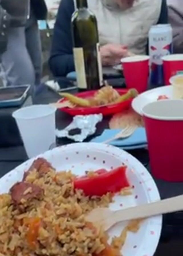 group of young adults gathered around a black table enjoying an outdoor meal. They are eating rice-based dishes and other foods from paper plates using wooden utensils. Red plastic cups and beverage cans are scattered across the table. Condiments and bottles of wine and sparkling water are also visible. The people are eating, drinking, and socializing. The setting appears to be a backyard or patio.