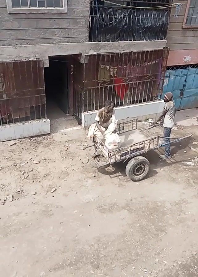 A man pushes a cart loaded with items on a dirt ground in front of a building. The building is two stories tall with windows and metal bars covering the openings. The cart has a tire and is carrying several sacks or packages. The man is wearing a hat and is pushing the cart away from the building. The ground is a mix of dirt and concrete.