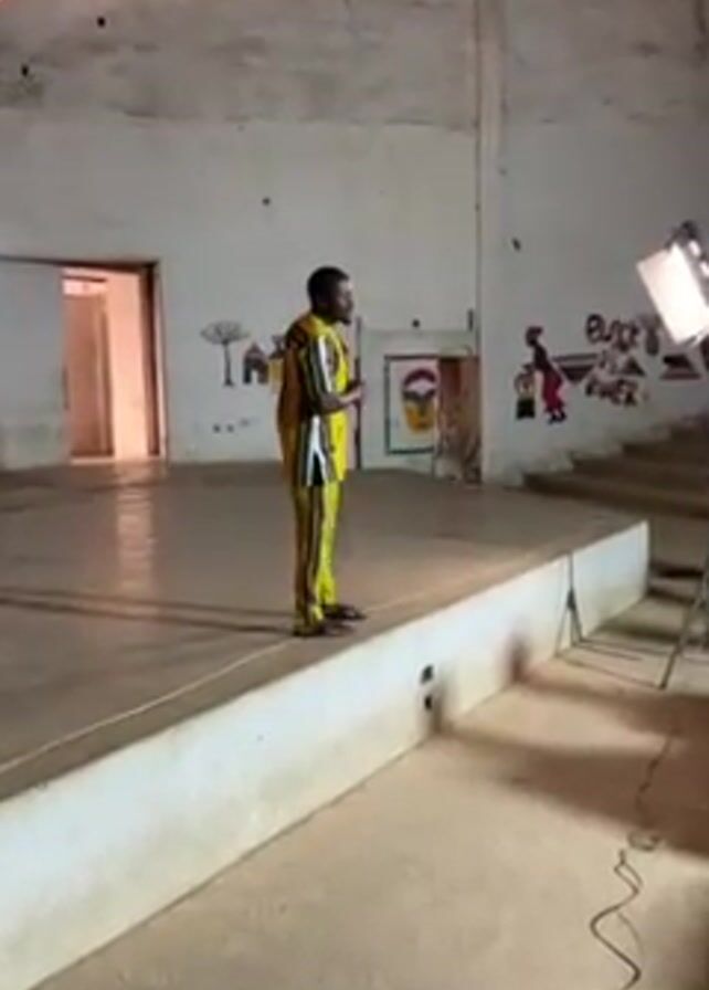 A man stands on a stage in a large room. The man is wearing a colorful striped shirt and matching pants. He has his hands clasped in front of him and appears to be speaking. The walls of the room are painted white, and there are some drawings on the wall. There is a doorway to the left of the stage. To the right of the stage is a set of stairs, and a light and cords are in the foreground. The room appears to be sparsely furnished.