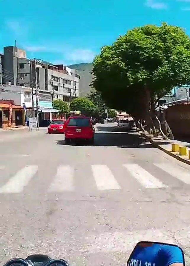first-person view from a motorcycle riding down a street in a town or city. The sky is clear and blue. There are buildings and trees lining the street. A red minivan is driving ahead of the motorcycle. Other cars are parked along the street. The speedometer on the motorcycle reads 44 kilometers per hour. The mirror reflects a person wearing a blue shirt.
