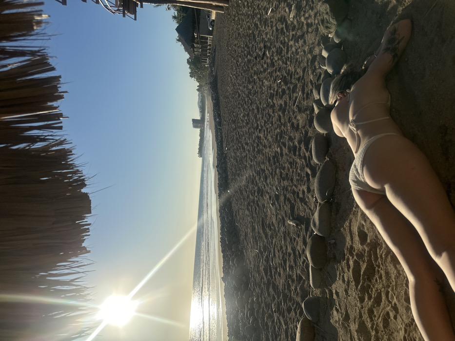 A woman in a light-colored bikini is lying on a dark sandy beach. She rests near a row of rocks or boulders that separate the sand from the beach's edge. In the background, a body of water meets the horizon under a clear blue sky. A bright sun is visible, and the light creates a glare on the water. Part of a thatched roof is visible in the corner.