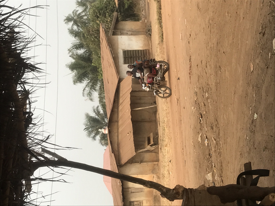- "Three individuals on a motorcycle travel along a dirt road in front of simple, low-rise structures with corrugated metal roofs" by FM-eGIJq1, licensed under CC BY 4.0