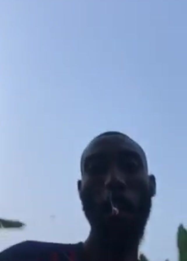person with dark skin, a shaved head, and a full beard holding a lit cigarette